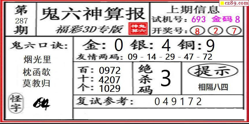 鬼六神算2025287期3d图谜