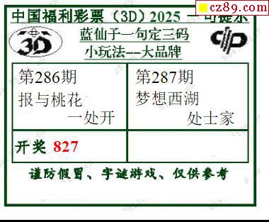 福彩3D2025287期彩赌侠一句定三码字图谜